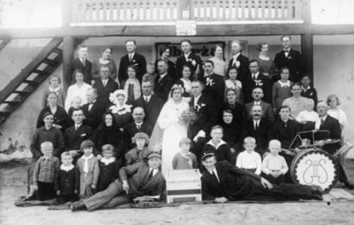 Pamiątkowe zdjęcie uczestników niezidentyfikowanego wesela z okresu międzywojennego